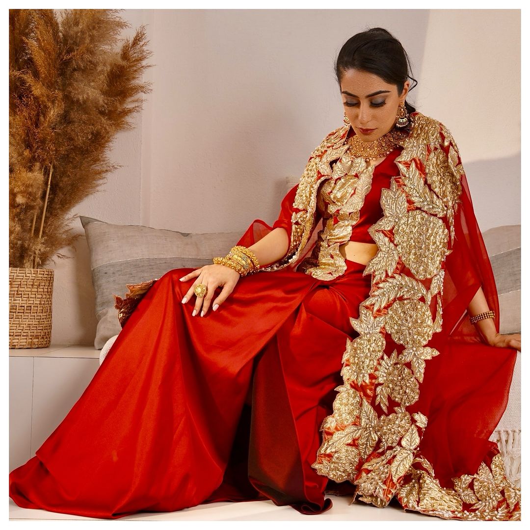 She looks stunning in maroon, showcasing our signature style with a glamorous touch. This outfit features a heavily hand-embellished border, combining Armani Satin and organza fabrics.